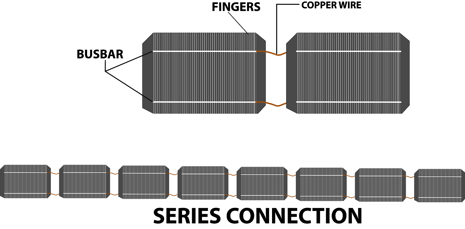 through copper wire. It forms a series of connections. We get the solar panel when we connect these series-connected cells in parallel with other series-connected cells.